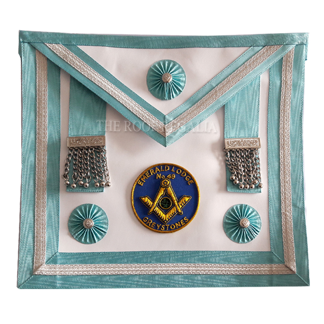 APRON pure lambskin made size 14x16 inch sky blue ribbon silver braided design front rosettes with silver metal s.c button, backing with pocket belt snake set enclosure