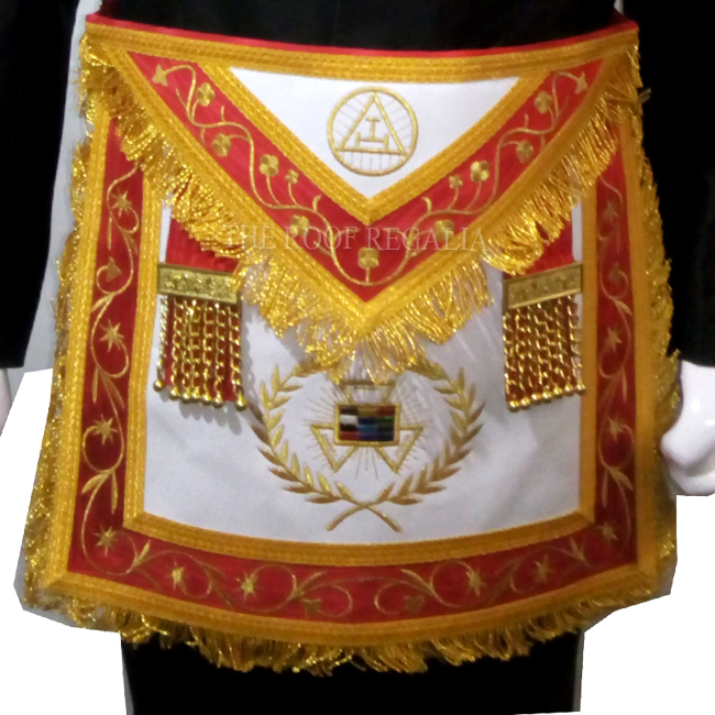PHP Apron machine made/handmade, red ribbon border, size 14x16 inch all designs are in gold Embroidered, Gold braid gold fringe, Backing pocket belt and metal snake enclosure.