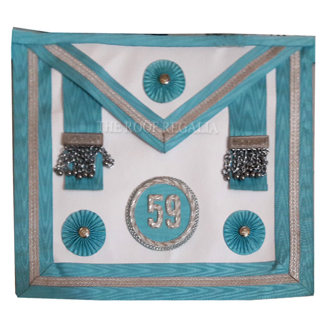 APRON pure lambskin made size 14x16 inch sky blue ribbon silver braided design front rosettes with silver metal s.c button, backing with pocket belt snake set enclosure